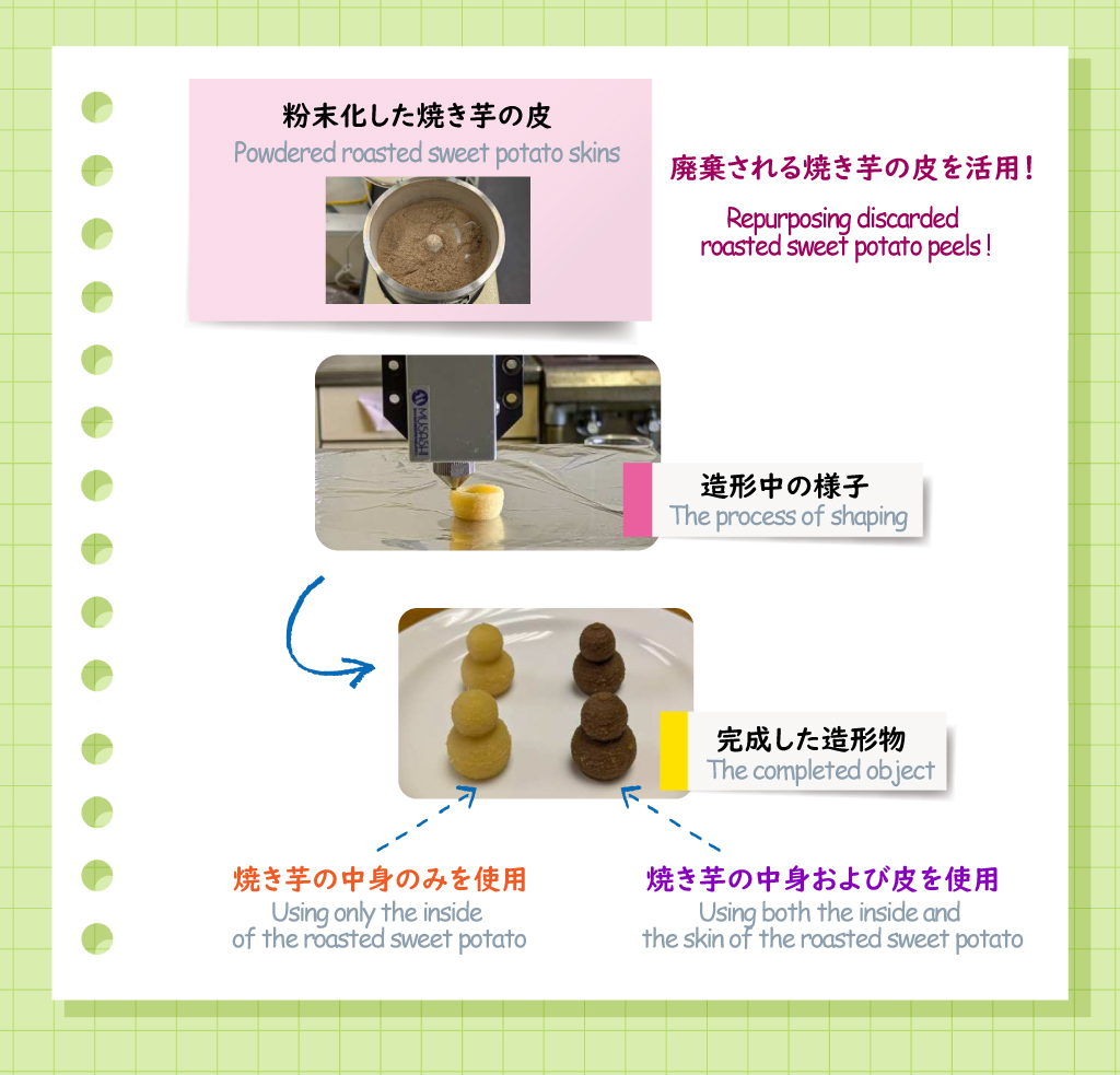 We worked on 3D modeling using grilled sweet potato skin. Usually, the skin of baked sweet potatoes is often shunned for reasons such as "hard" or "bitter", and is discarded and contributes to food loss. Therefore, the skin of baked potatoes is dried in a microwave and powdered with a crusher. The powder was added several% to the material for 3D modeling. As a result, we achieved a smooth finish that is comparable to that of using only the contents of sweet potatoes.