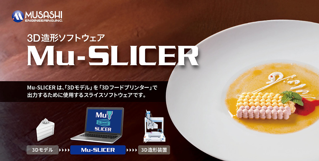 From here, we will explain the procedure with our food printer. We have our original slice software called Mu-SLICER, which makes it easy to operate with 3D data.