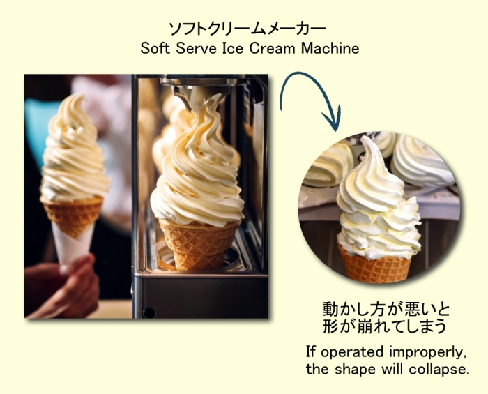 Even if the speed and amount of soft ice cream come out of the machine is constant, the shape of the soft ice cream will collapse if the way of moving the cone (motion) is unstable. The same applies to 3D food printers.
