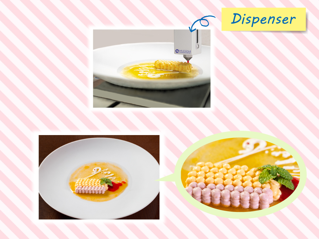 The following picture is an example of a nursing food. This is a photo of a dish made when a collaboration between Tokyo Medical and Dental University (now Tokyo University of Science) and a chef who also handles swallowing French cuisine. It is a 3D creative mousse dish with a 2D application inspired by a swan with fresh cream and a collection of spheres. It is possible to produce from 2D to 3D with a single hood printer by applying our dispensing technology, which is not found in other companies.With a beautiful look, you can enjoy a meal from both sight and taste.