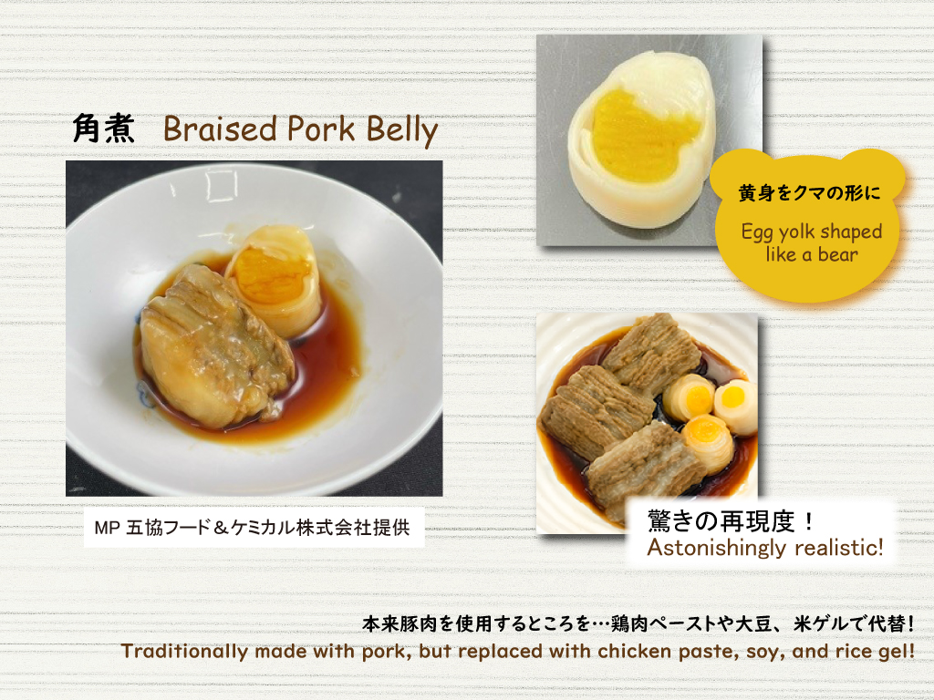Normally, pork is used, but ingredients that match the individual's constitution, creed, and taste, such as using chicken paste-shaped ingredients for calorie control and Vee cancer response, or using plant-based soybeans. It is possible to select. For the fat part, we used additives (gelizing agents) that give a fat-like texture without using oils and fats, but it is also possible to utilize naturally derived materials such as coconut oil.