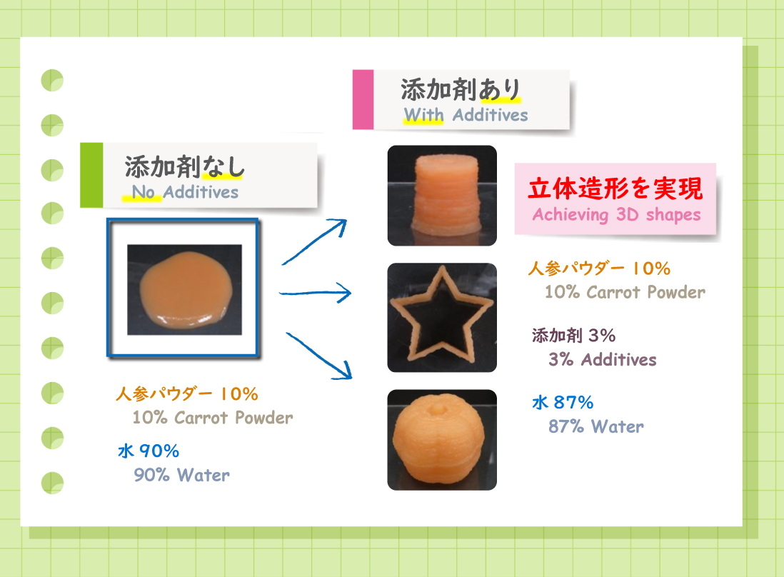 Additives are useful to solve the problems of these materials themselves. Even if it is a material with high fluidity like water, by adding additives, it is possible to make it sticky and maintain its shape. In addition, by combining the technology of 3D food printers, three-dimensional modeling can be realized.