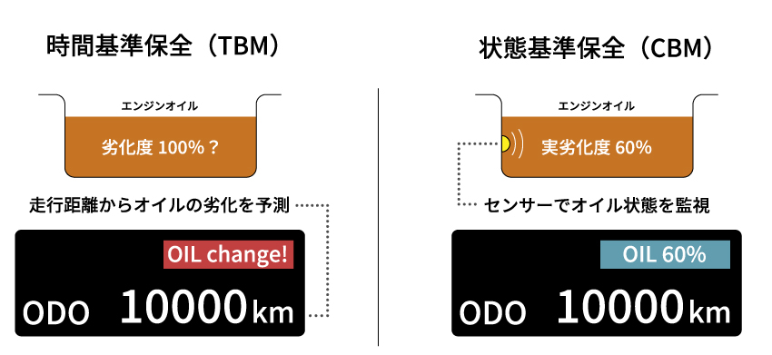 For example, in the case of a car, it is common to change engine oil regularly, judging from the mileage and duration of the car. The guide varies depending on the driving conditions of the car, so it is difficult for the driver to accurately calculate when replacement is required. In recent years, not only simple mileage, but also vehicles that encourage oil change by comprehensively judging the speed of engine rotation and the frequency of short-distance driving, and vehicles that directly measure the quality of oil have been born. The information provided by these vehicles is more accurate to determine oil degradation and enable maintenance at the right time.