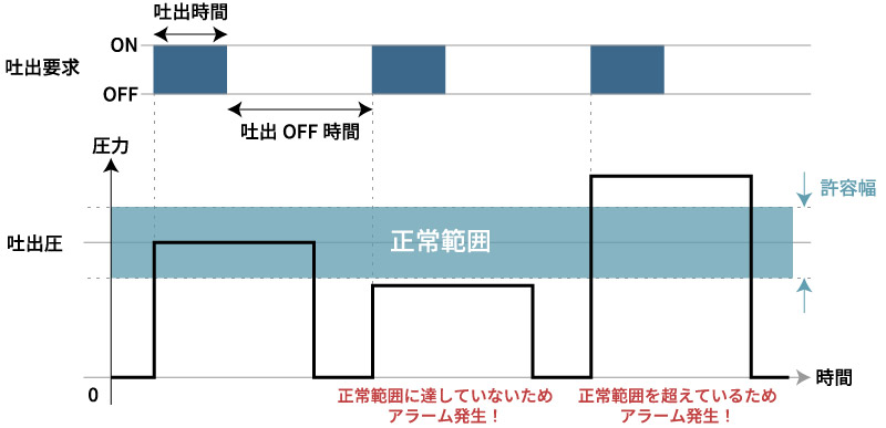 Among our air pulse Dispenser, the ML-8000X and SuperΣCMIV series are equipped with the "Exit Pressure Monitoring" function as new features. This allows you to monitor whether the pressure coming out of the Dispenser is as set for each discharge operation. We can optimize maintenance timing and reduce unnecessary costs by combining the frequency of the alarm with the occurrence of defects at the customer's production site, as well as using the alarm to know when an abnormal discharge occurred.