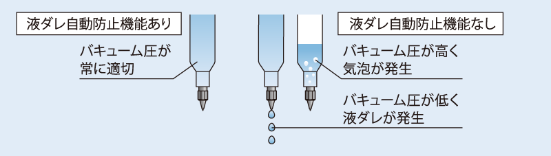 The liquid dalle automatic anti-stop function automatically adjusts the vacuum pressure according to the amount of liquid agent remaining, preventing fluid leakage and air from the tip of the Nozzle, greatly contributing to improving production and quality.