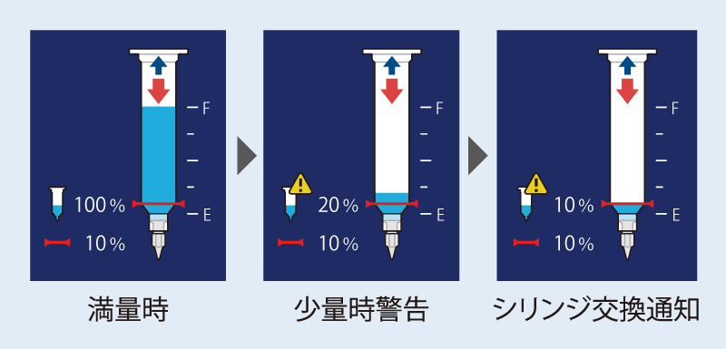 Accurately detects the remaining amount immediately before the material disappears and warns in two stages to prevent problems caused by interruption of work or running out of materials.
